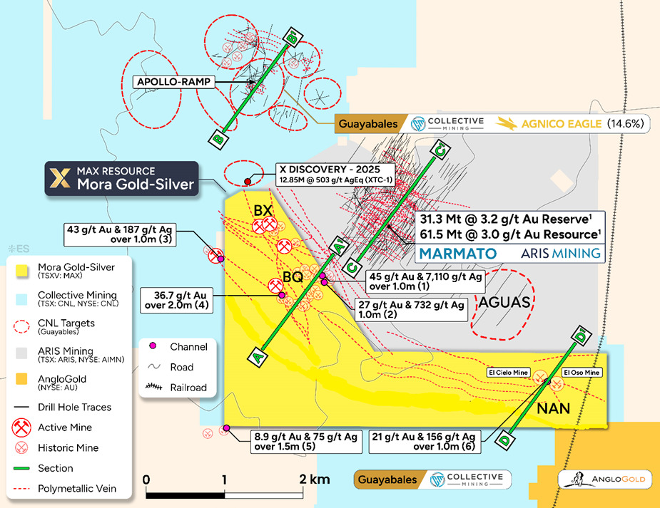 Mora Gold Silver in Colombia (right to purchase 100%) lies along the most productive Middle Cauca Gold Belt encompasses over 40 historic workings, 5 active mines, a series of exposed polymetallic structures spread over 2,500m by 1,000m. Mora's 8.2 km border is surrounded by Collective Mining's (TSX, NYSE: CNL) Guayabales Gold Project and Aris Mining's (TSX: ARIS, NYSE: ARMN) Marmato 9.2Moz¹ gold operations.